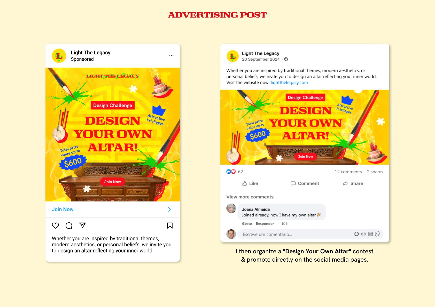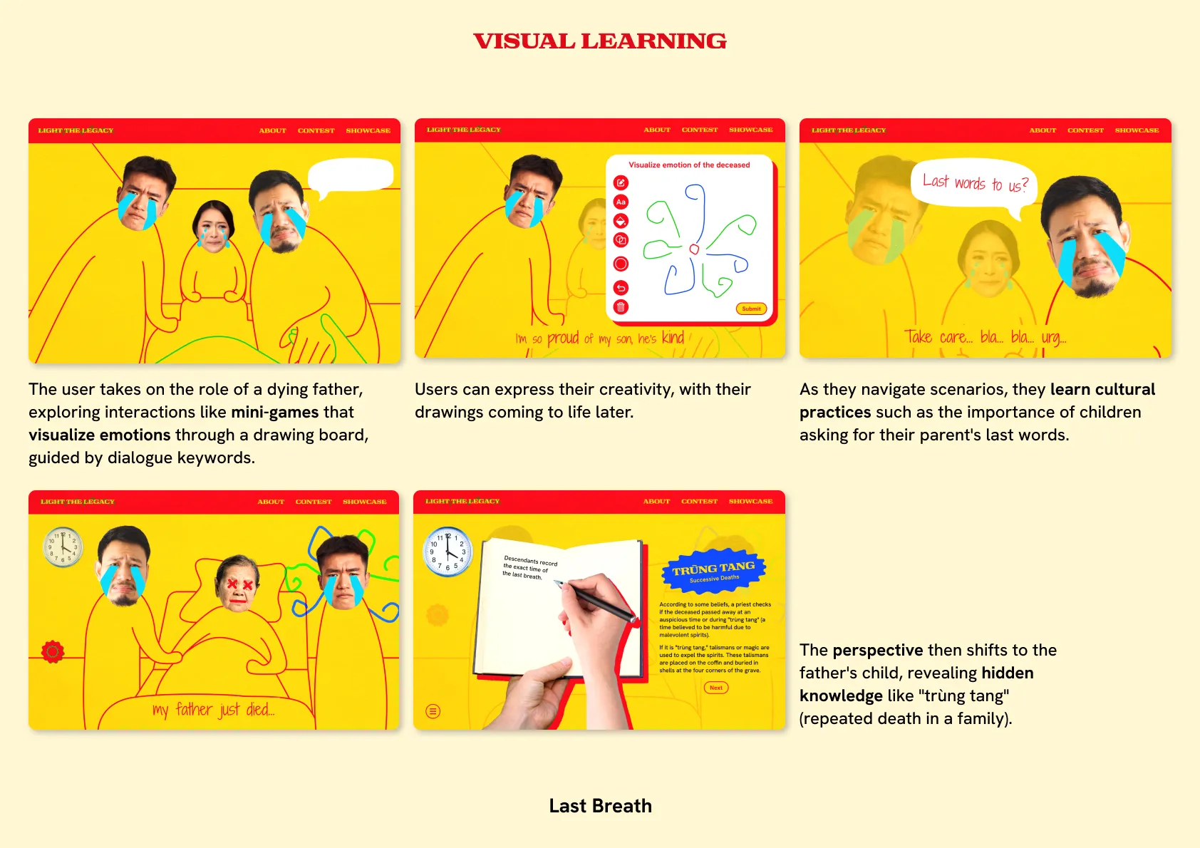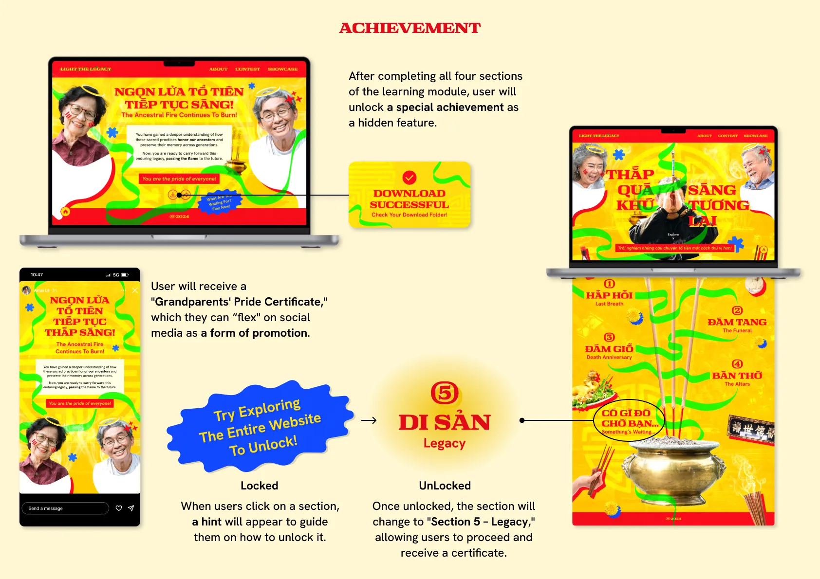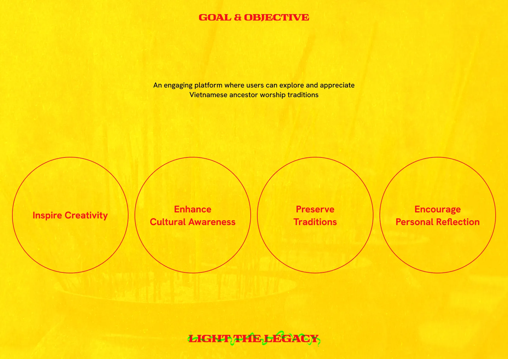 Light The Legacy is an interactive digital platform that reimagines Vietnamese ancestor worship for young creative professionals. Through multimedia storytelling, role-playing, and user-generated content, it makes this tradition engaging and accessible. The project aims to inspire creativity, foster cultural pride, and connect users with their heritage in a meaningful, modern way.