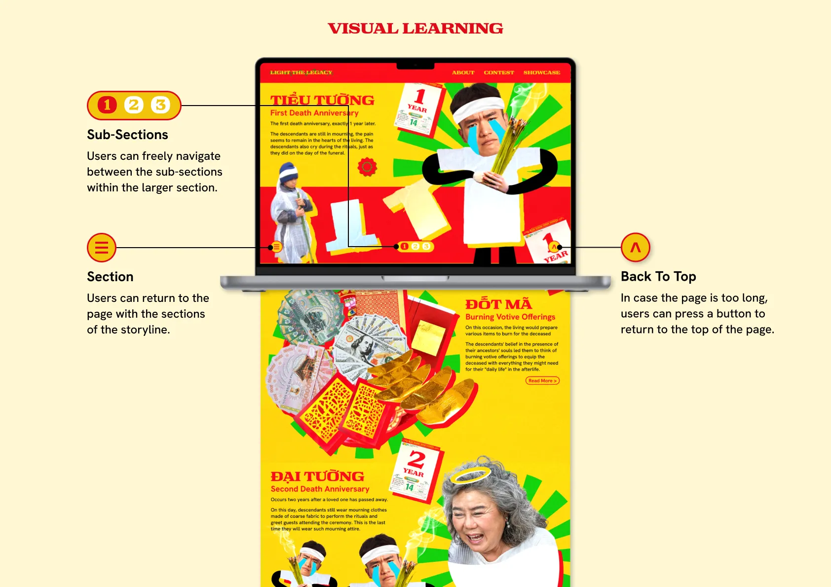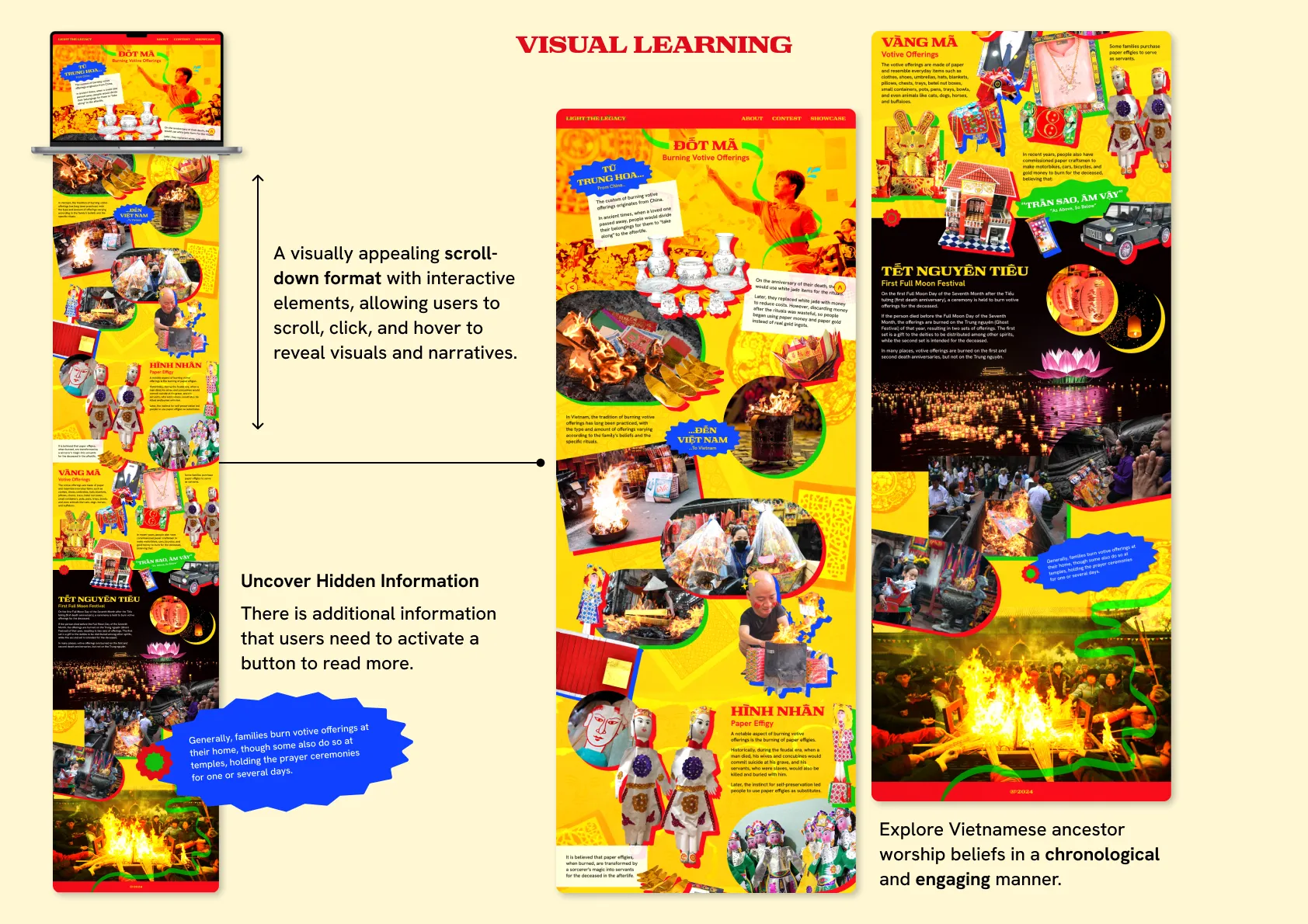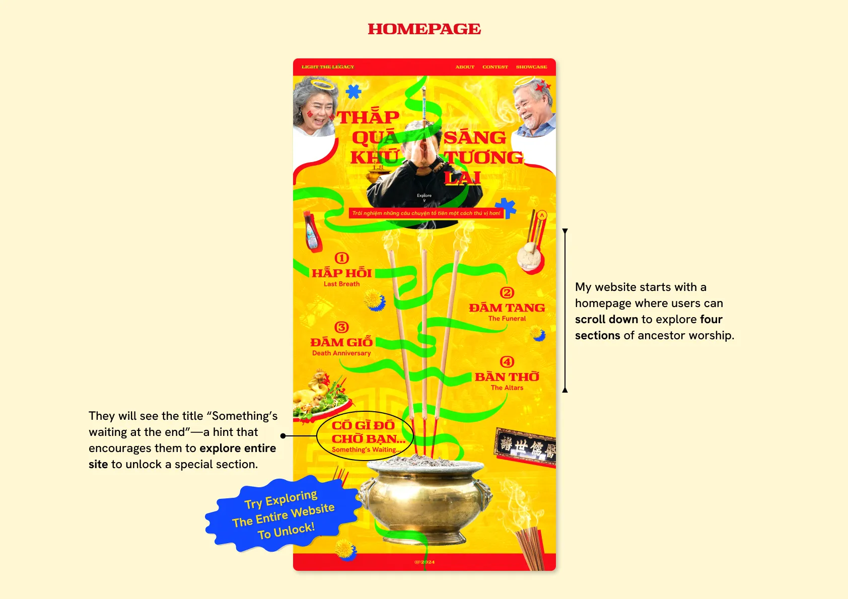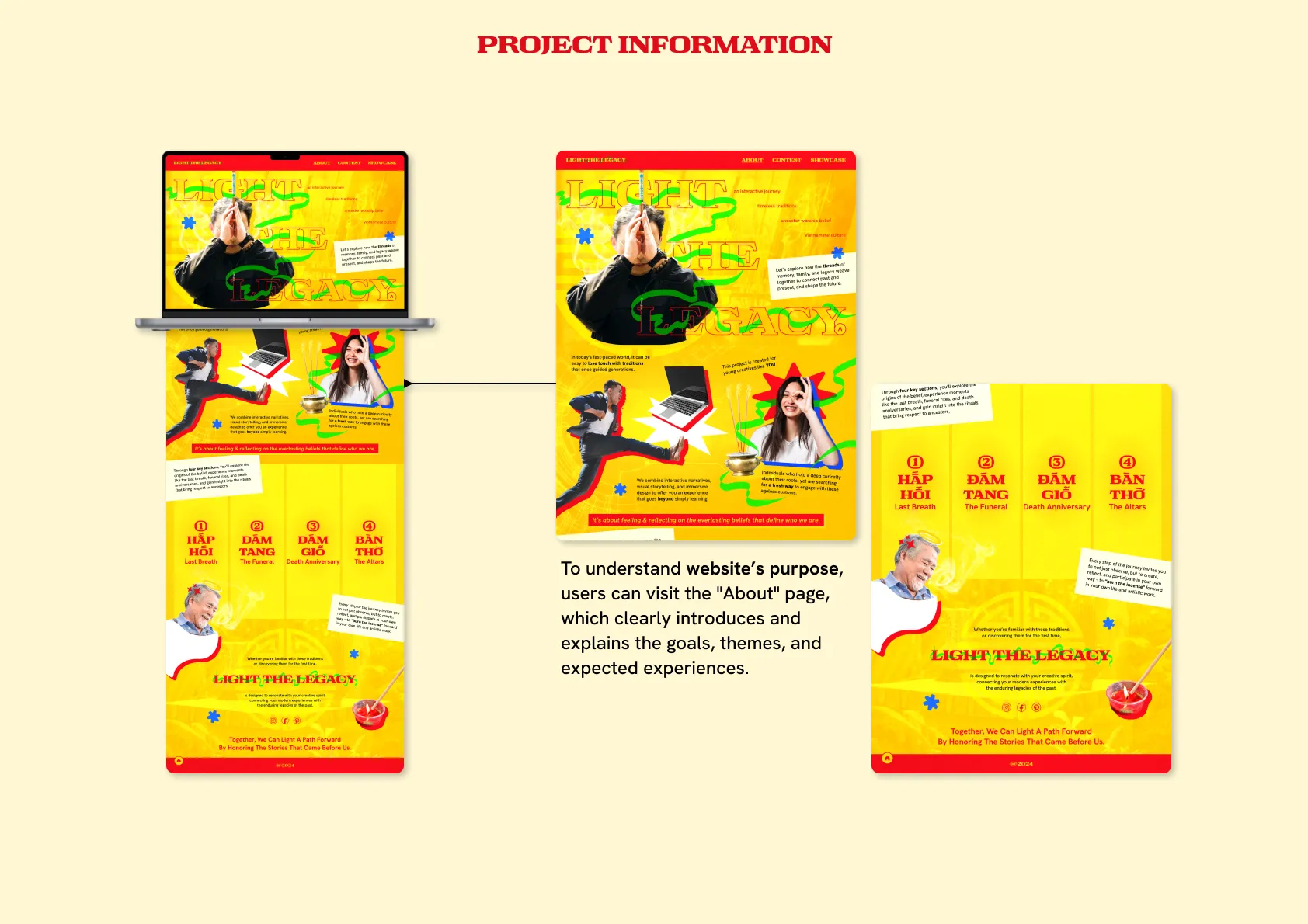 The website was designed as an interactive storytelling space, guiding users through a personalized journey rooted in Vietnamese ancestor worship. With clear structure, intuitive navigation, and smooth transitions, the interface encourages exploration while balancing cultural depth with modern digital behavior.