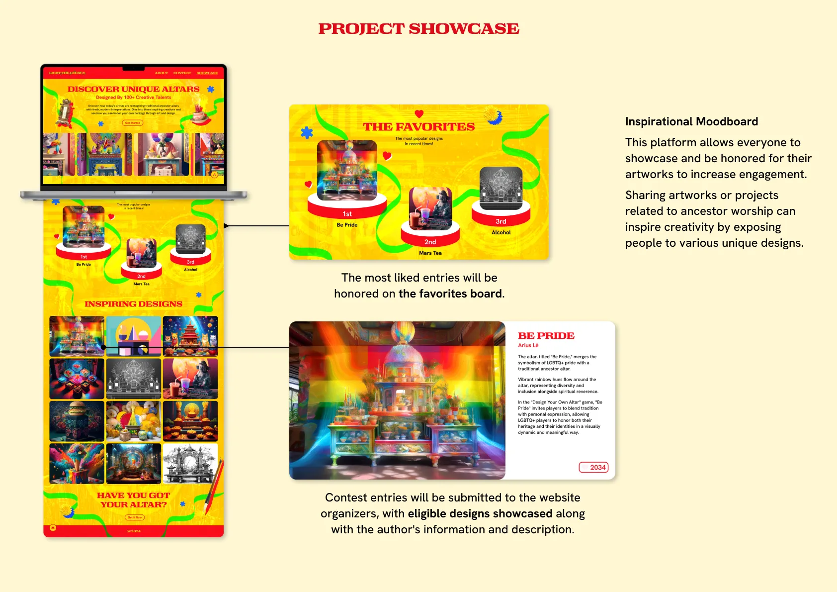 Key features were presented through dynamic mockups and user flow simulations, highlighting the platform’s interactive altar builder, story-based role-playing, and content-sharing elements. This showcase demonstrated how design can make cultural rituals engaging and relatable for a younger, creative audience.